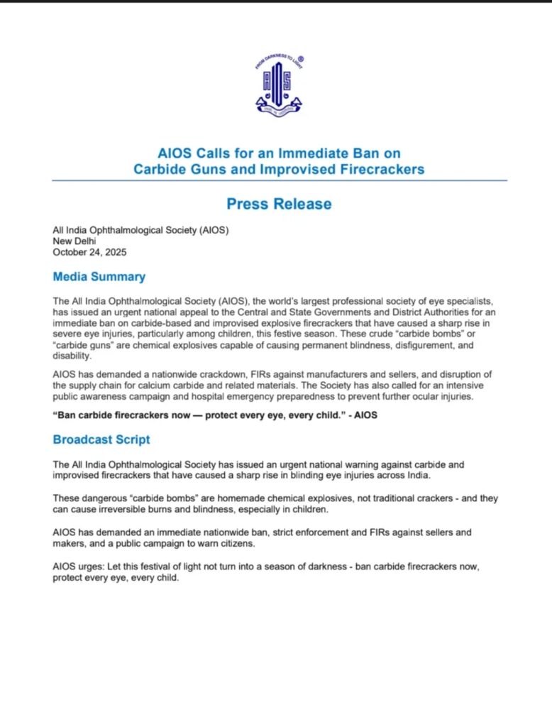 2 thoughts on “ऑल इंडिया ऑप्थॉल्मोलॉजिकल सोसायटी (AIOS)ने केंद्र और राज्य सरकार से कार्बाइड गन और क्रेकर को तुरंत बैन करने की अपील!”