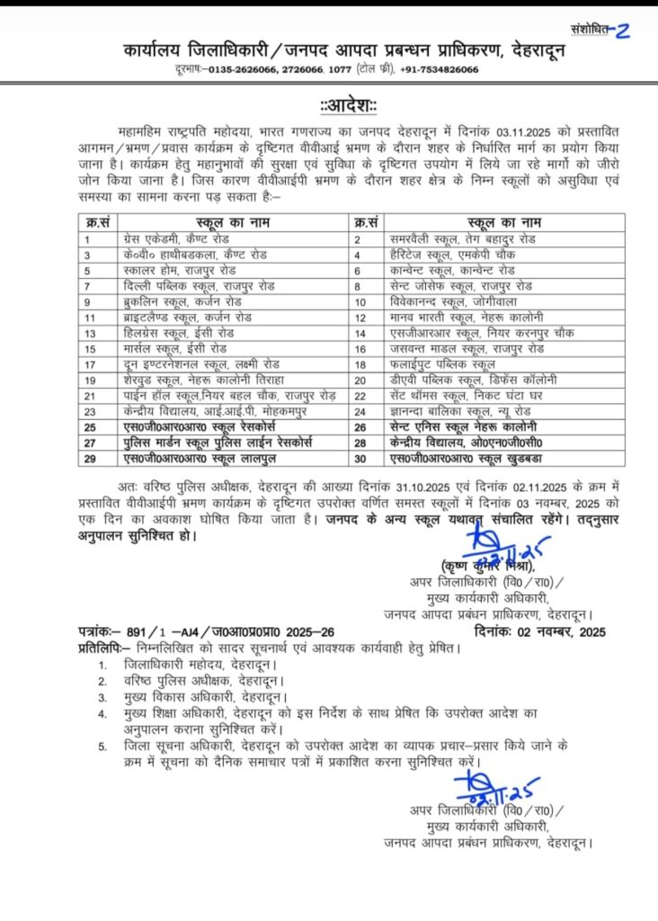देहरादून। जनपद देहरादून में अति विशिष्ट महानुभाव के भ्रमण कार्यक्रम के दृष्टिगत और कई स्कूलों के अनुरोध पर कुछ स्कूलों को दिनांक 3 नवंबर 2025 को जिला प्रशासन द्वारा अवकाश घोषित किया गया है ताकि यहां बच्चों और उनके अभिभावकों को कोई दिक्कत ना हो इसलिए ये फैसला लिया गया है।